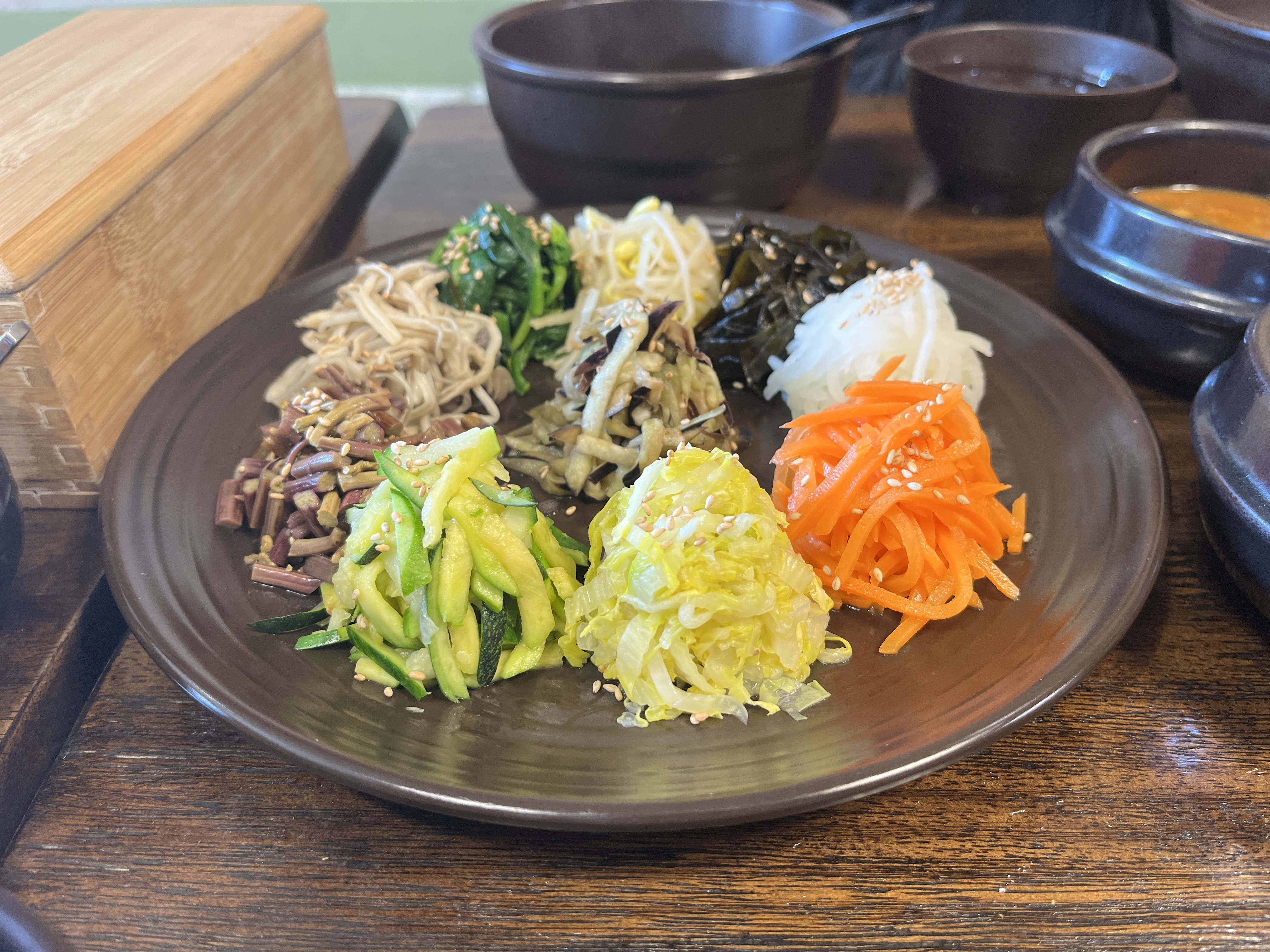 콩나물, 미역, 무채, 당근, 배추(얼갈이?), 애호박, 고사리, 느타리버섯, 시금치, 가지 (시계방향, 중앙 - 가지) 정성껏 하나하나씩 조리한 10가지의 다양한 나물이 나온다. 아눌러 된장지게와 개인적으로 좋아하는 비지찌게도 함께 나온다.
